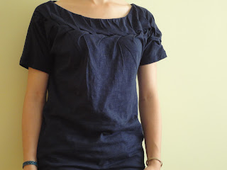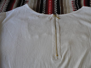 -Lo primero que compré fue esta camiseta, bastante peculiar. La encontré en MANGO, y costó alrededor de 13 €. Lo que me gustó fue el trenzado que tiene alrededor del cuello. La trenza va descendiendo desde el hombro.
